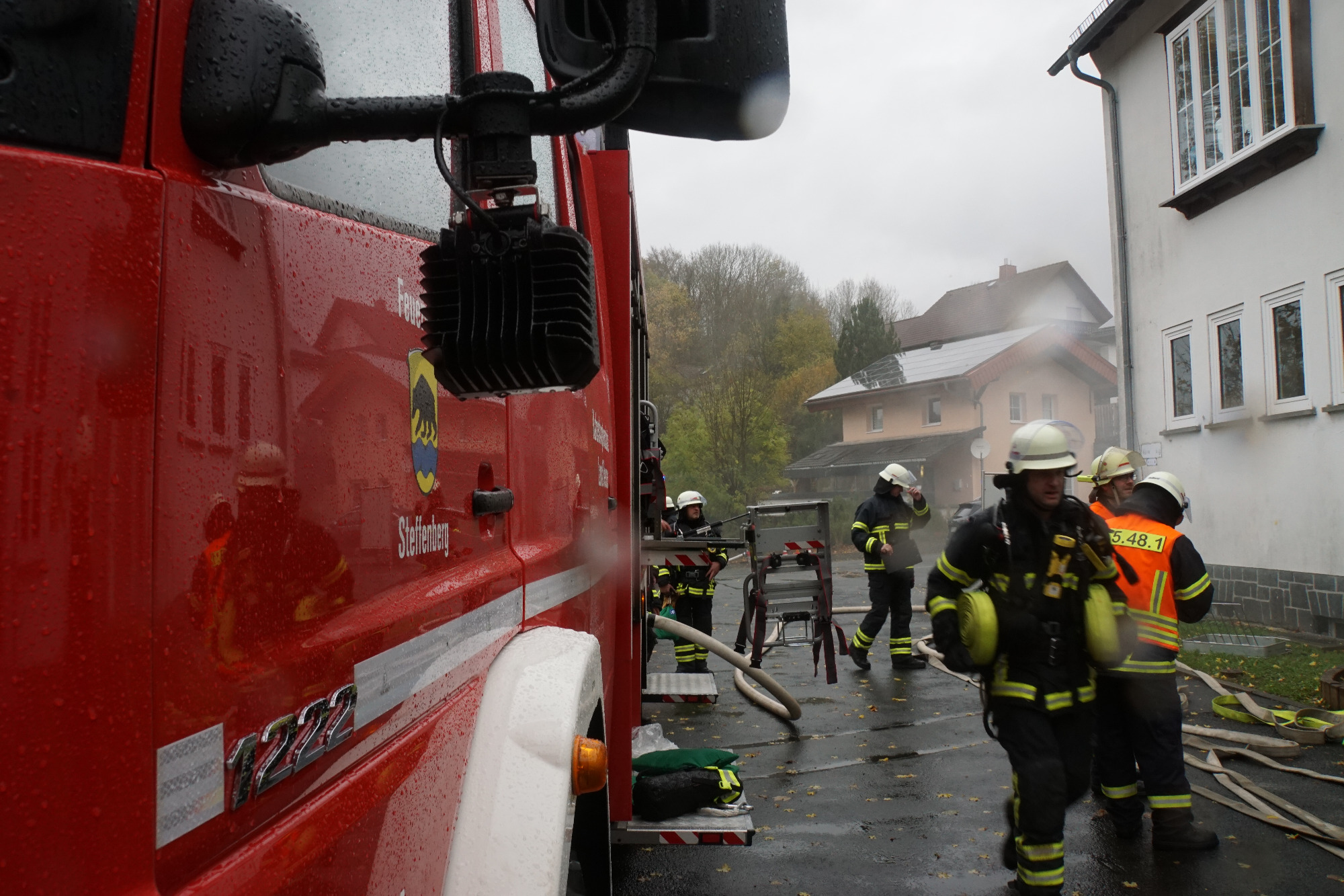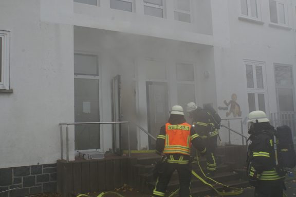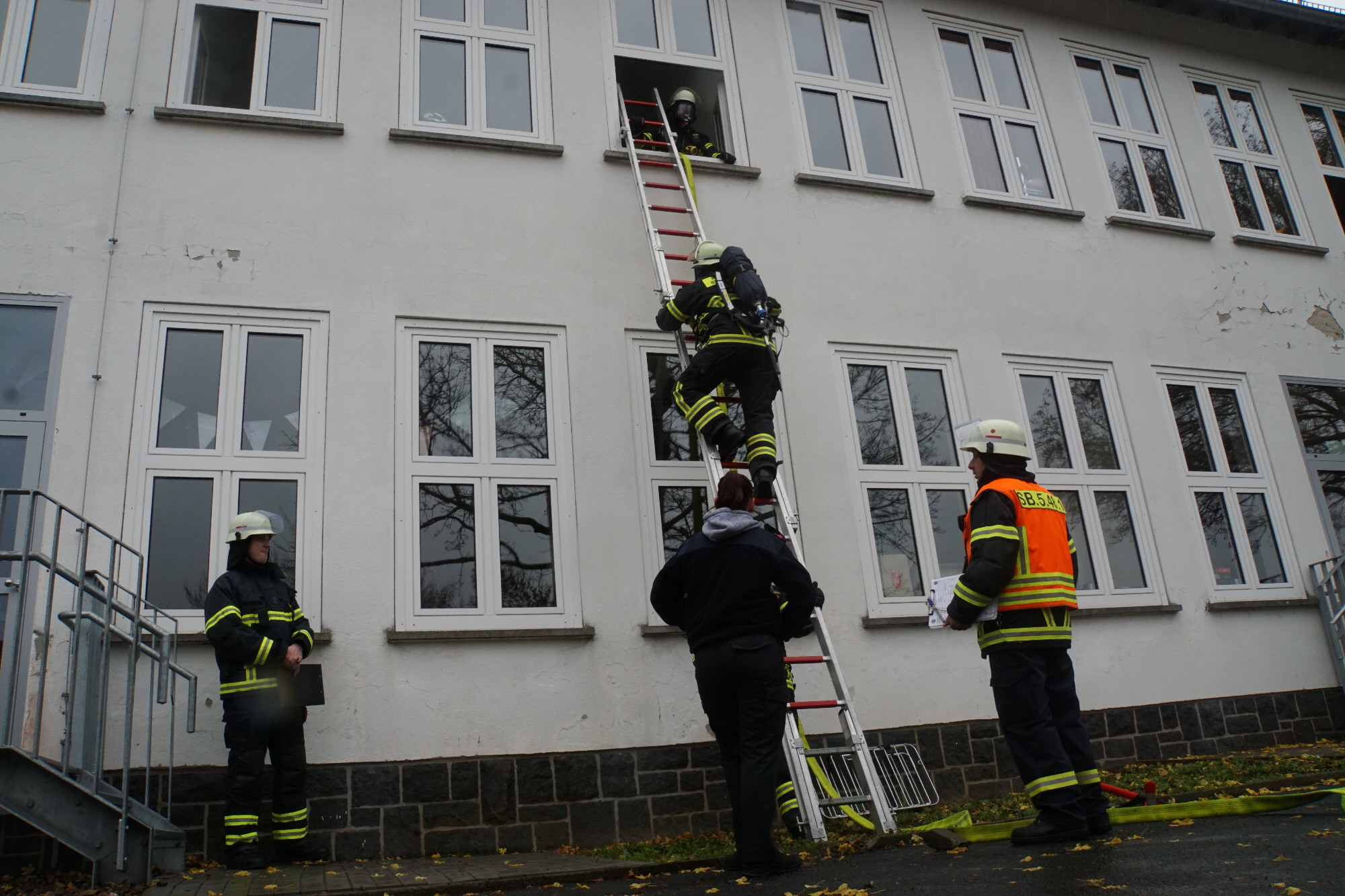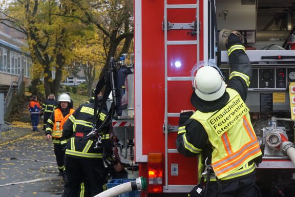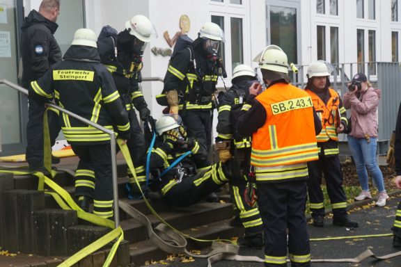 Die Feuerwehren hatten alle Hände voll zu tun. Lage erkunden, Brandbekämpfung und Menschenrettung vorbereiten und durchführen, Wasserversorgung sicherstellen, etc. Das alles unter möglichst realistischen Bedingungen mit 0 Sicht im Gebäude. Mehrere Trupps unter Atemschutz waren im Einsatz. Ein Trupp musste seinen Angriffsweg über die Steckleiter ins OG bestreiten.