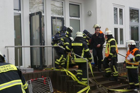 Alarmierung F-BMA. Der Hausmeister meldet, dass Rauchmelder ausgelöst haben. Im Keller war eine Heizungsfirma mit Reparaturarbeiten beschäftigt, wobei die Heizung zu brennen begann. Im Keller wurde ein Monteur vermisst. Der zweite Monteur hatte, bei dem Versuch sich zu retten, die Orientierung verloren und ist schließlich im Flur liegen geblieben. im 1. OG befand sich zudem noch eine Schulklasse, bestehend aus 7 Kindern und einer Betreuerin, die eine Exkursion nachbereitet hat. Im weiteren Verlauf der Übung, genauer gesagt während der Brandbekämpfung im Keller, wurde obendrein noch ein simulierter Atemschutznotfall eingespielt.
